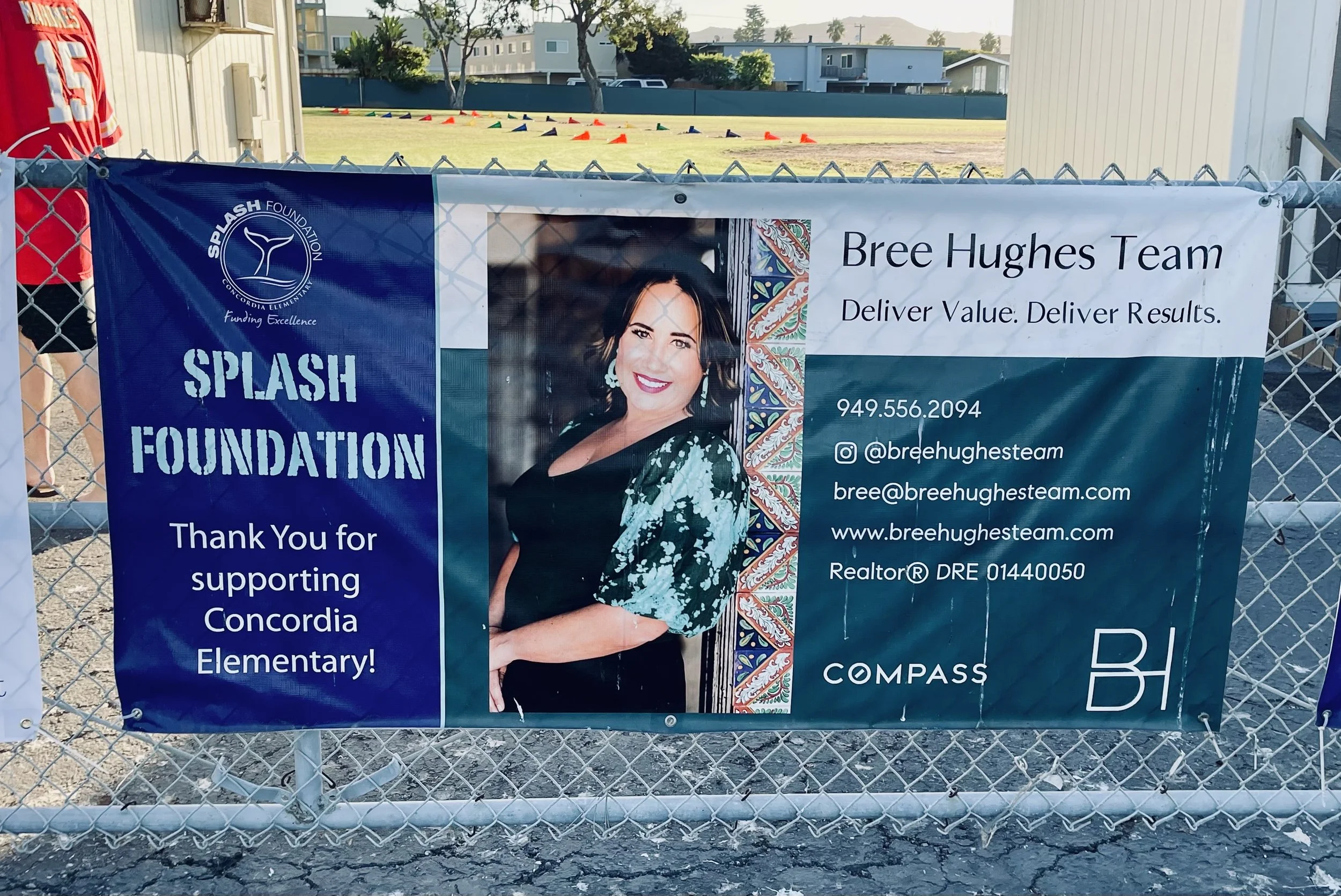 For a $500 tax-deductible donation to the Splash Foundation, your Business Banner will be displayed on the school campus parking lot and visible to all campus visitors for an entire school year (9 in-session months).